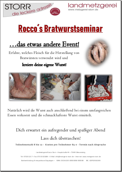 Am Anfang wird Ihnen gezeigt, wie aus dem rohen Stück Fleisch eine klassische Bratwurst entsteht. Anschließend können Sie Ihrer Kreativität freien Lauf lassen und durch Beimischen von unterschiedlichen Kräutern Ihre eigene einzigartige Wurst erstellen.